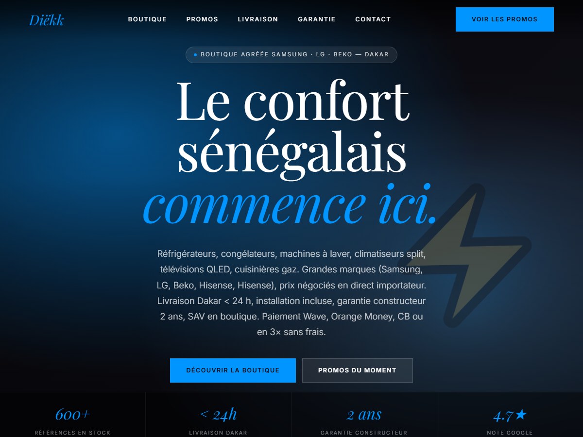 Diëkk signifie « lumière · électrique en wolof » et résume parfaitement la promesse de ce thème : réfrigérateurs, machines à laver, climatiseurs, télévisions — grandes marques, garantie constructeur, livraison dakar 24h.