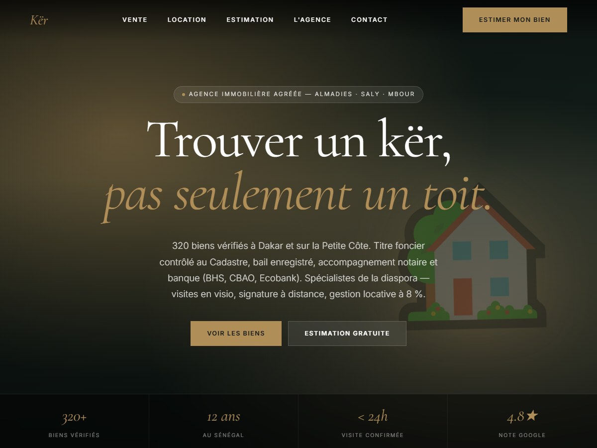 Kër signifie « maison · foyer en wolof » et résume parfaitement la promesse de ce thème : appartements, villas, terrains, locaux commerciaux. plus de 300 biens d’exception à dakar et sa région.