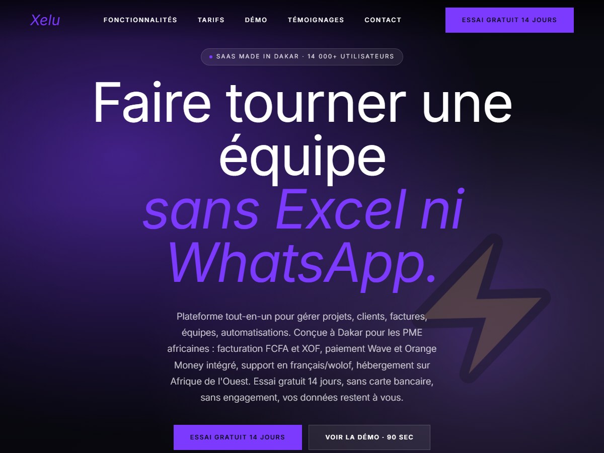 Xelu signifie « intelligence · vivacité en wolof » et résume parfaitement la promesse de ce thème : une plateforme tout-en-un pour gérer projets, équipes et clients. essai gratuit 14 jours, sans carte bancaire.